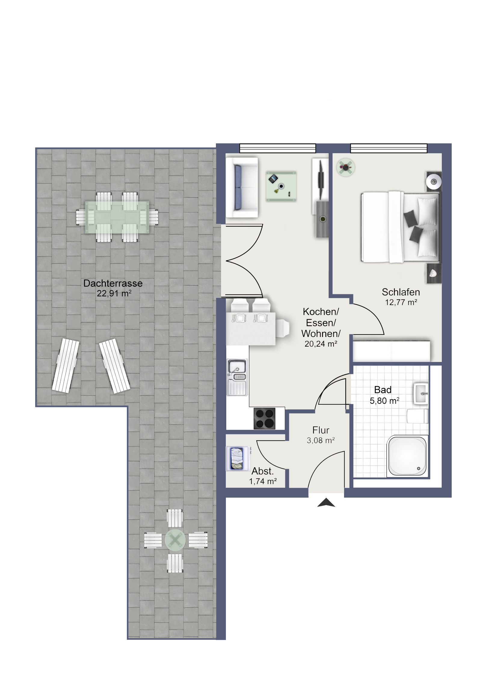 Die Dachgeschosswohnung überzeugt durch einen behaglichen Wohn- und Essbereich, der offen in die Küche übergeht und die sonnige Dachterrasse erschließt. Schlafzimmer, sowie ein hell gefließtes Bad, bieten den künftigen Bewohnern einen perfekten Lebensraum.